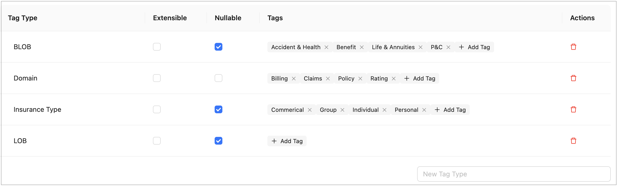 To delete a tag type, click the Delete icon in the Actions column of the tag type row and confirm the deletion.