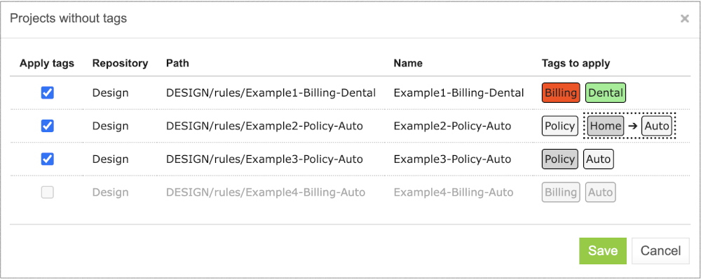 - Grey — A tag is already assigned to the project. The project still appears on the list because it has other tag types with the None values. If the tag is already assigned, but a different tag value is derived from the project name according to the template, the existing value will be replaced with the derived value. The replacement is identified with the arrow. The derived value can be created if the tag type is extensible. In this case, a new value will be marked green. If the derived tag value does not exist and the tag type is not extensible, no replacement happens, and the old value appears in grey with no arrow.