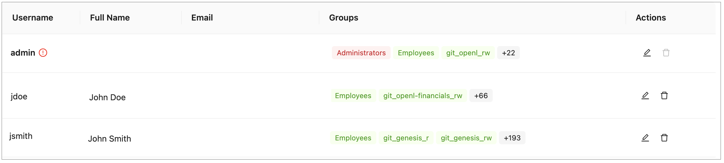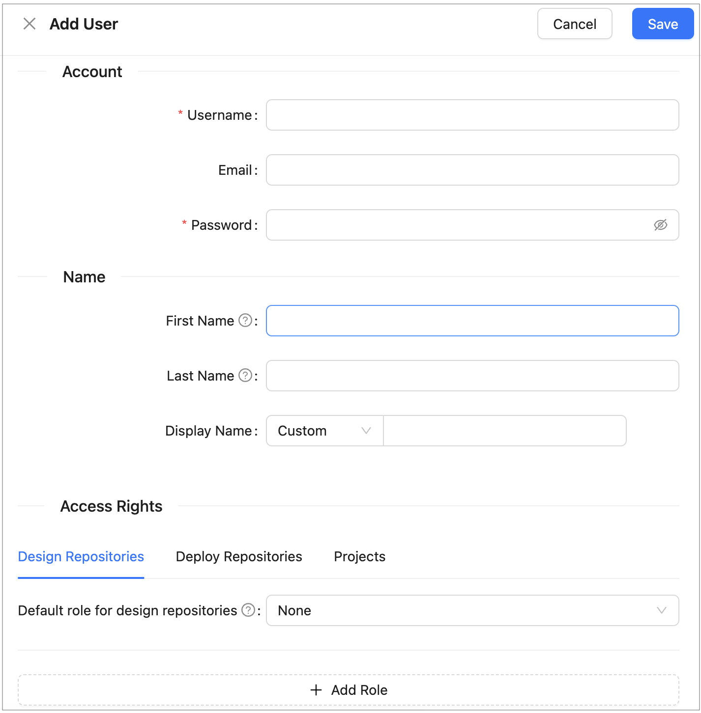 A user is created in OpenL Studio automatically upon the user’s first login using credentials from the identity provider. Users cannot be added manually. User information such as first name, last name, display name, and email address is retrieved from the identity provider and saved to OpenL Studio with those fields locked for editing. If some information is not available from the identity provider, the corresponding fields are editable in OpenL Studio. An exception applies to SSO with external user management, where user data cannot be edited in Admin > Users and only partial data can be edited in the user profile section.