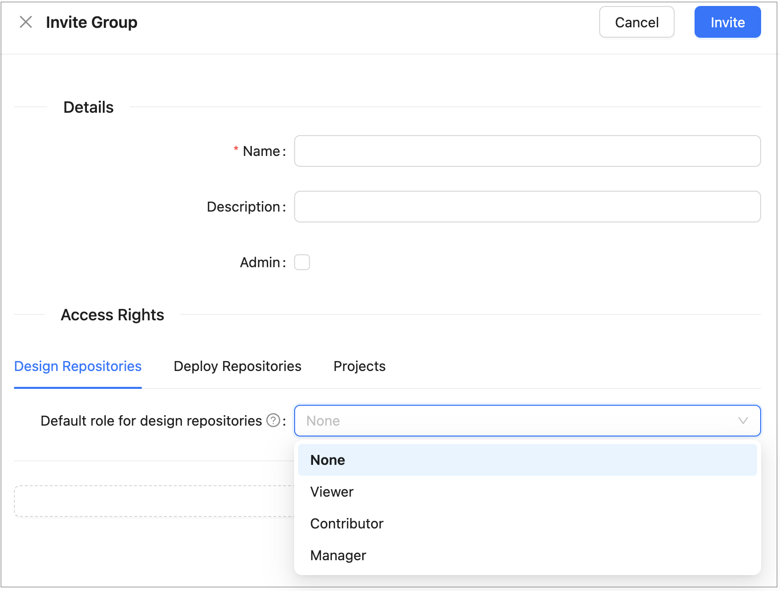 Field Description Resource The repository or project to which access is granted. Select from the available repositories and projects. Mandatory. Role The role to assign for the selected resource: Viewer, Contributor, or Manager. Mandatory. To grant access to multiple resources, add a new row for each resource. The same resource cannot be assigned more than one role.