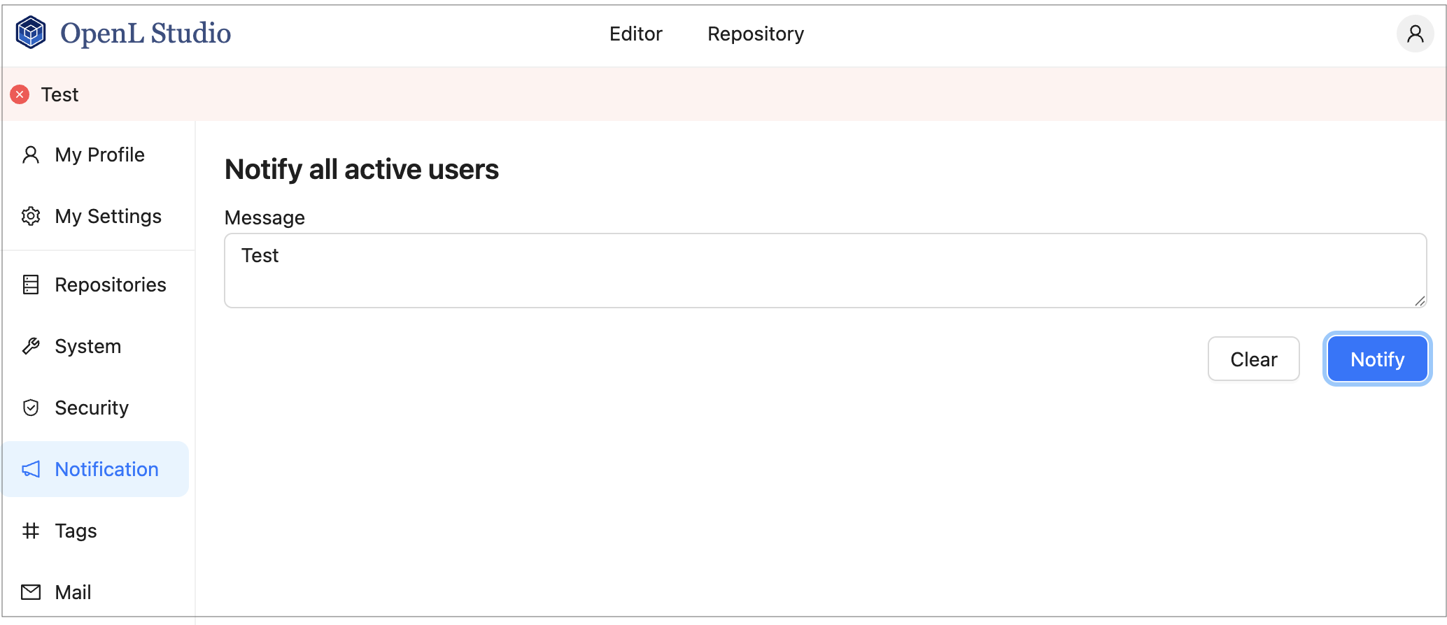 In the navigation menu, click Notification to open the notification management page. Users with administrator privileges can send a text message to all currently active OpenL Studio users and instances, or clear a previously sent notification.