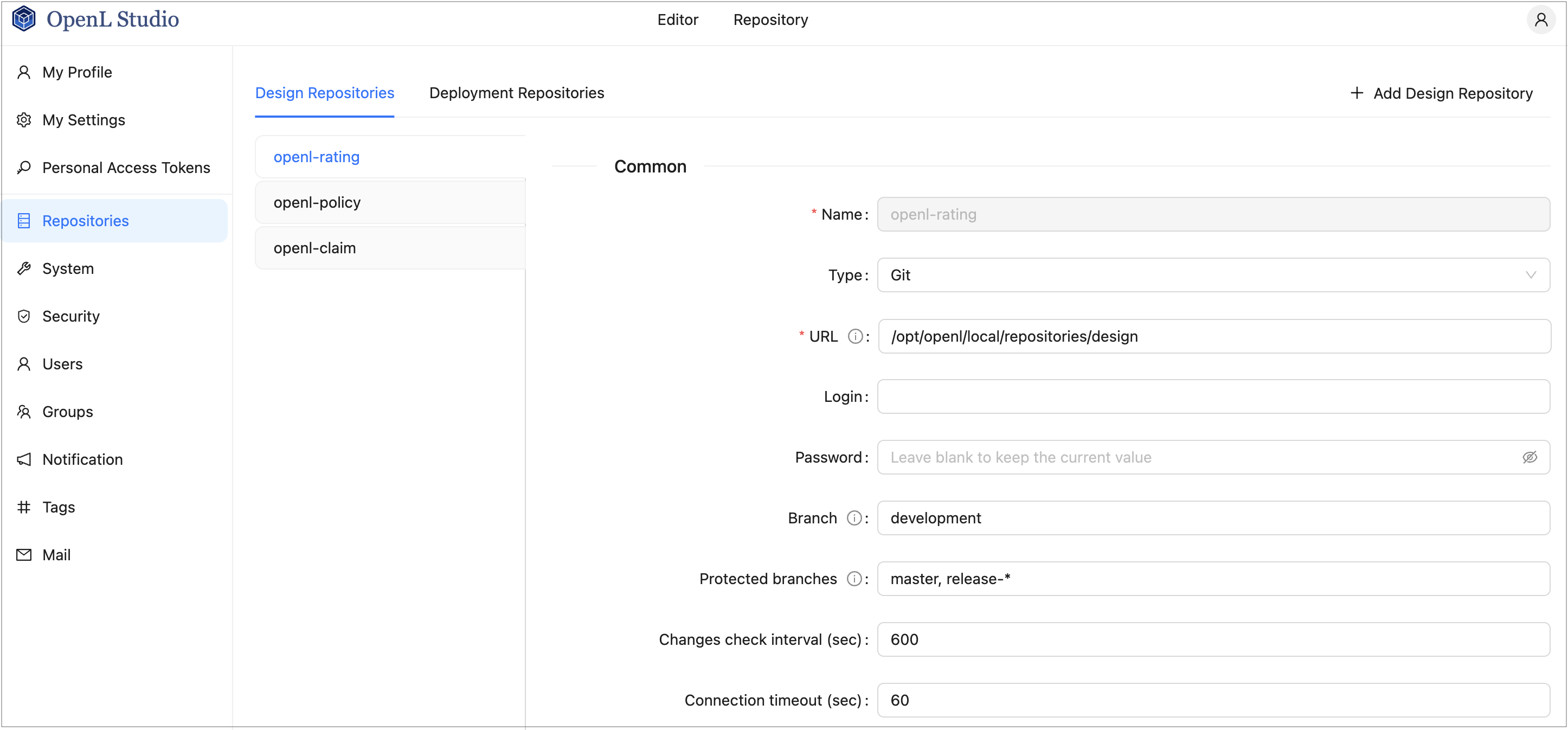 For more information on repository security, see OpenL Tablets Installation Guide > Configuring Private Key for Repository Security.