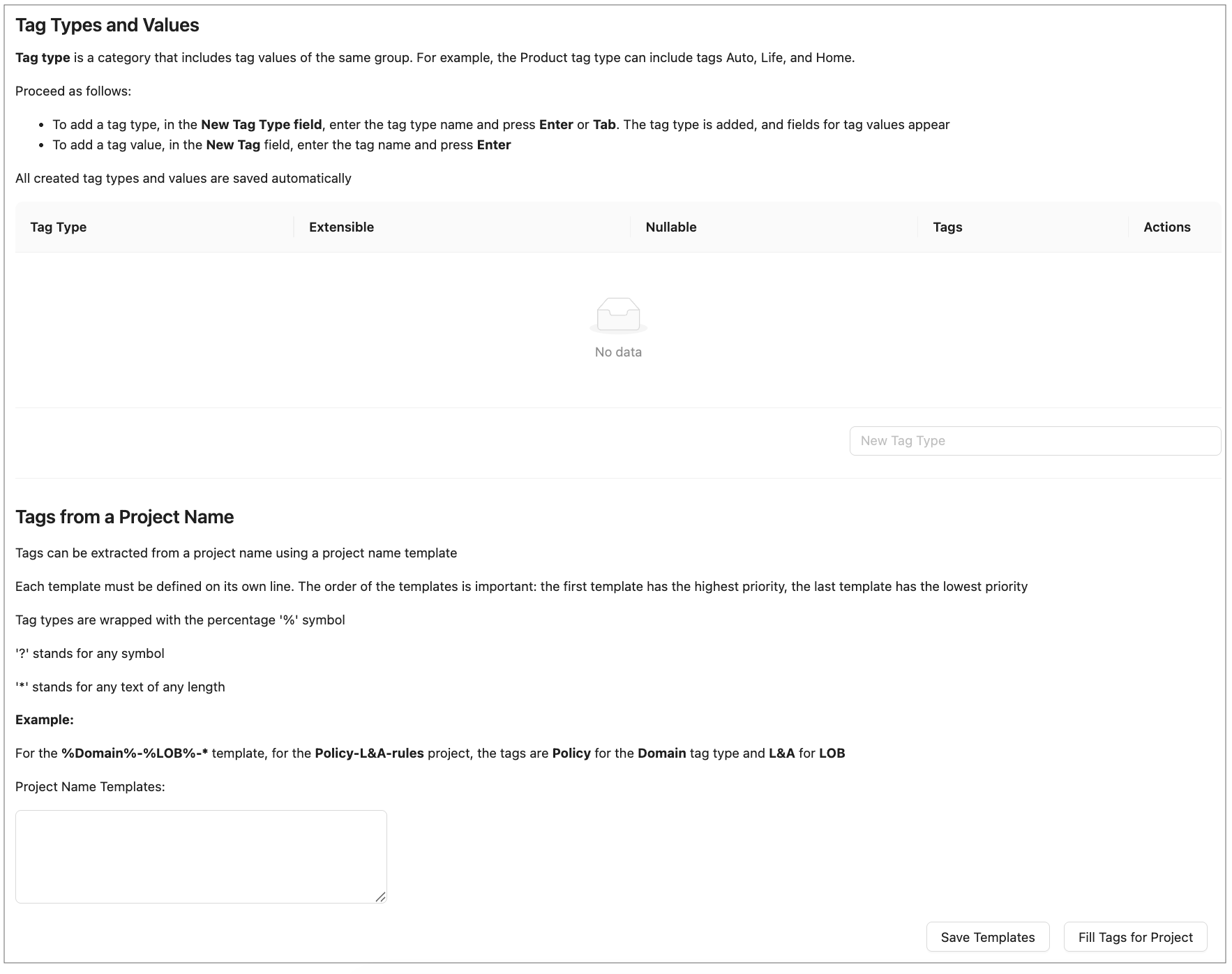 - Tags from a Project Name — where templates for deriving tag values from project names are defined.