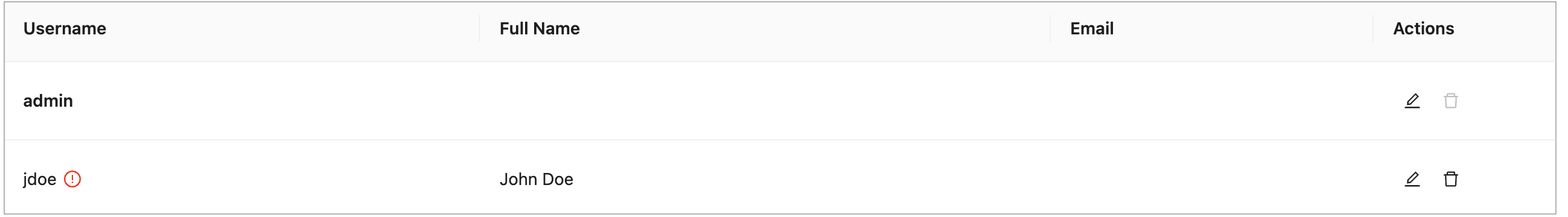 The system displays the new user in the Users list. If the username and password values are the same, an exclamation mark is displayed next to the username. A user can change the password to improve security.