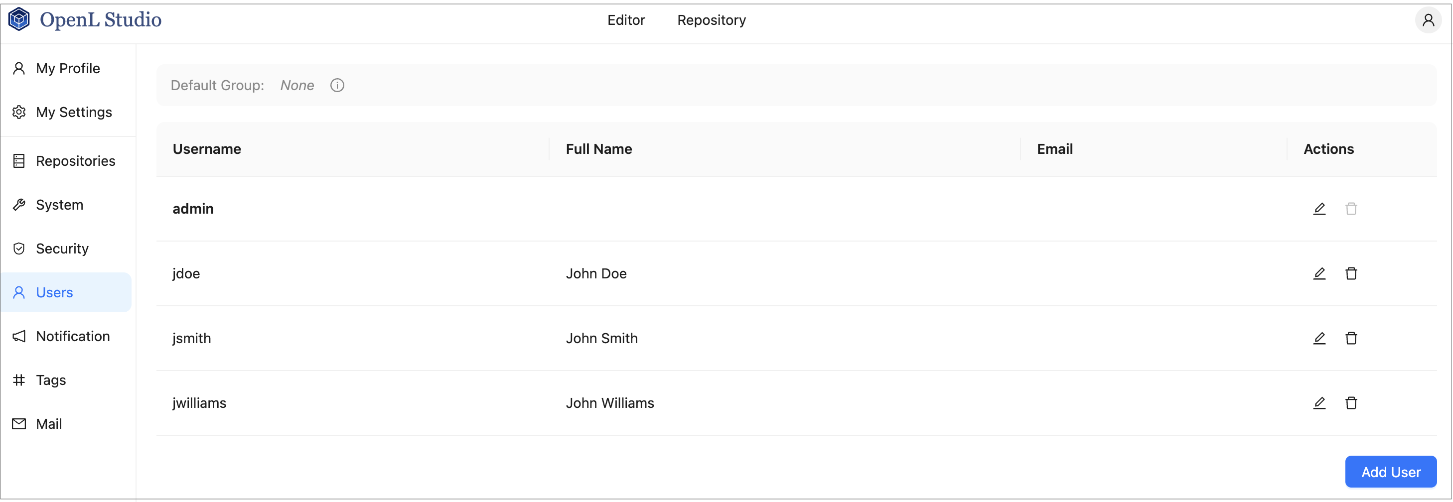 There are some differences in managing users when OpenL Studio is configured to authenticate against a third party identity provider, such as an SSO provider or Active Directory.