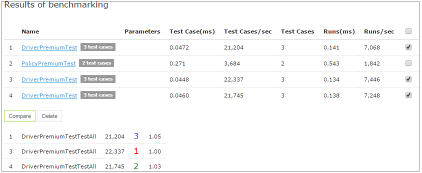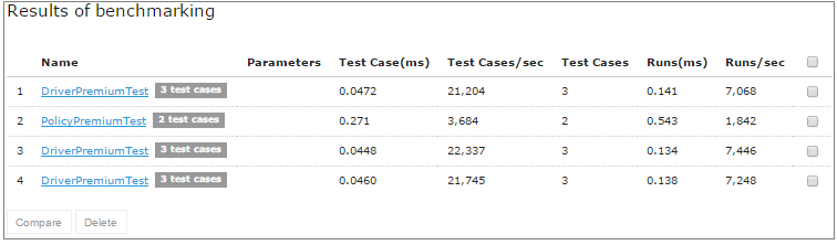 OpenL Studio remembers all benchmarking runs executed within one session. Every time a new benchmark is run, a new row is added to the results table. Benchmarking results can be compared to identify the most time consuming methods. Select the required check boxes and click Compare to compare results in the results table. Comparison results are displayed below the benchmarking table.