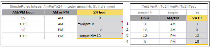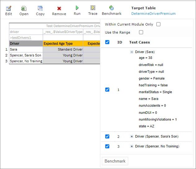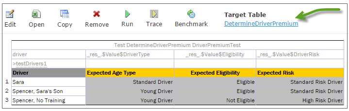 For example, in the following diagram, the table on the left is a decision table but the table on the right is a unit test table that tests data of the decision table: