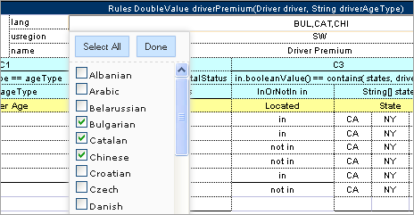 OpenL Studio allows editing comma separated arrays of values. A multi selection window displaying all values appears enabling the user to select the required values.