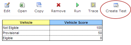 When an executable table, such as Decision, Method, Spreadsheet, ColumnMatch, or TBasic table, is created, the Create Test item becomes available.