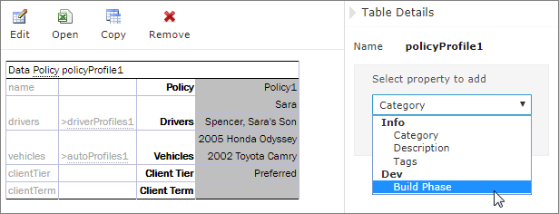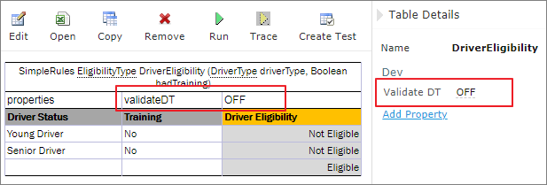 For example, such property as Validate DT is available for Decision Tables. That means it can be selected in the drop-down list after clicking the Add link at the bottom of the Properties section. The following figure shows properties applied to a Decision Table: