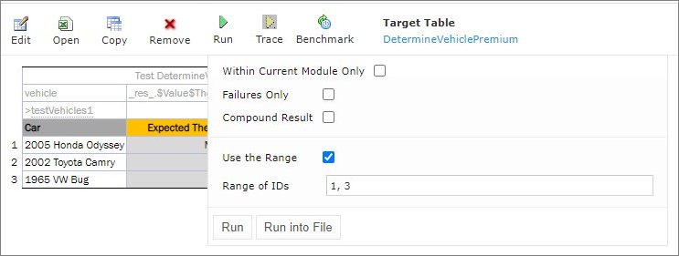 In the pop-up window that appears, select or clear the check boxes for the appropriate IDs, and to run several particular test cases, define them in the Use the Range field.
