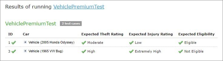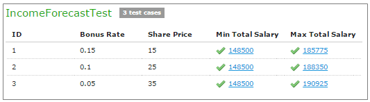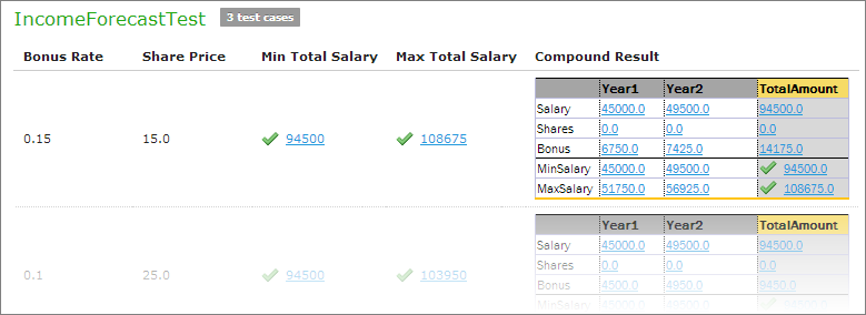 In cases when test result is complex (compound), there is an option to display the full result of running test cases as well, not only values which are being tested. It is configured for each user individually in User Profile as “Compound Result” setting. If the option is switched on, the result of running IncomeForecastTest looks as follows: