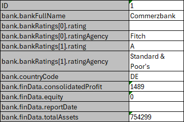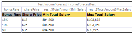 The result of a rule table execution can be a single value or compound value such as spreadsheet. A test table specifies what is tested, full result or particular parts of it, and their expected results of each test case. In the following example, IncomeForecastTest is intended to check Minimal and Maximal Total Salary values in the resulting spreadsheet: