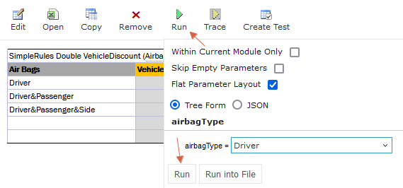 In the module tree, select the required rule table and click the green Run arrow