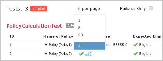 , and in the pop-up window that appears, select or clear Failures only. - Select or clear the Failures only setting that appears on the top of the window upon executing all tests at once as displayed in Figure 107: Number of tests per page setting.