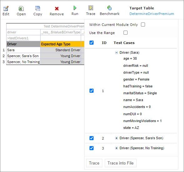 If there is a set of test cases and the result of each step of the rule and how the result was obtained need checking, trace the Test table as follows: