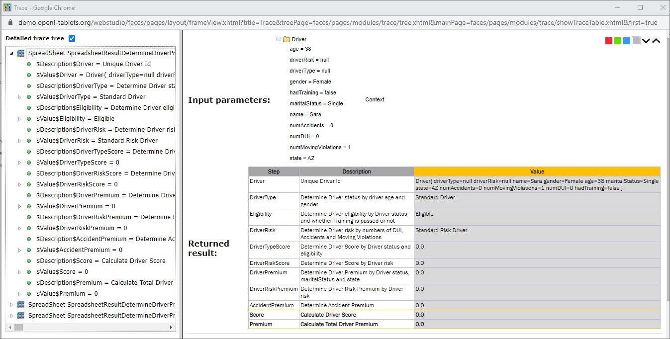 OpenL Studio provides a rule tracing view for all appropriate OpenL Tablets methods. These methods include the following: