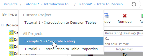 Rules Editor displays one module at a time. To switch between modules, select a module in the Projects tree or use breadcrumb navigation for quick switching between projects or modules of the current project.