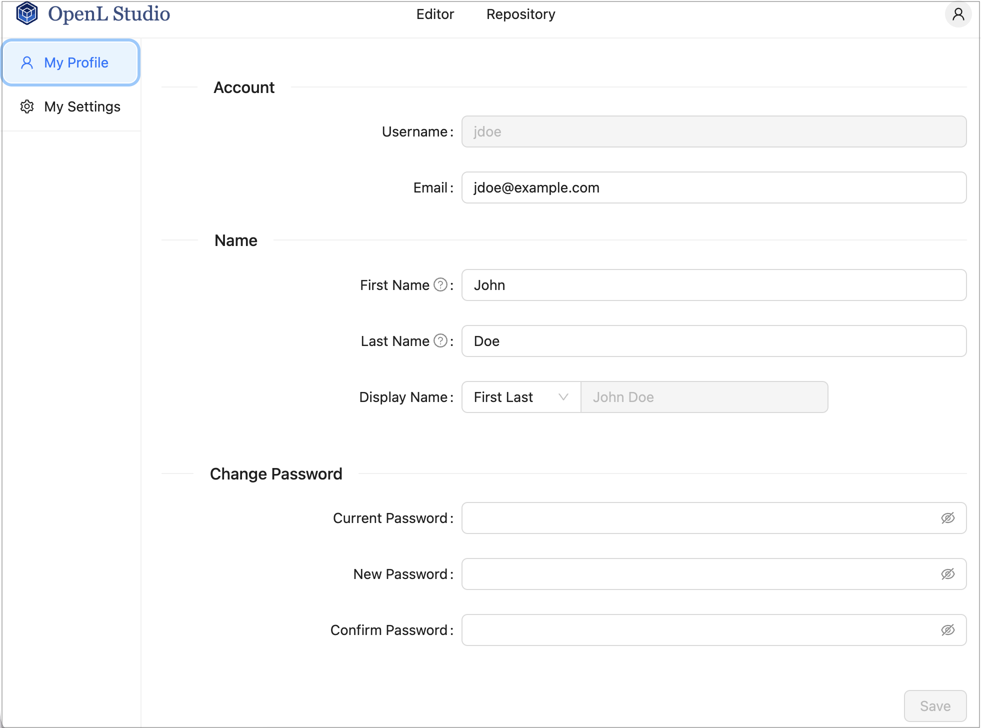 - If the display name value is empty in OpenL Studio and the third party service, but the first name and last name values are not empty, the display name is set to “first name + space + last name”, regardless of the pattern specified upon local user creation.