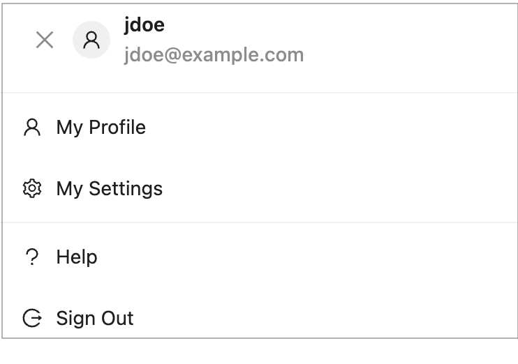 OpenL Studio provides a navigation panel accessible from the top-right corner of the application for updating profile information and editing personal settings. To open it, click the user icon in the top-right corner. The panel displays the current username and email address, and provides access to the following items: