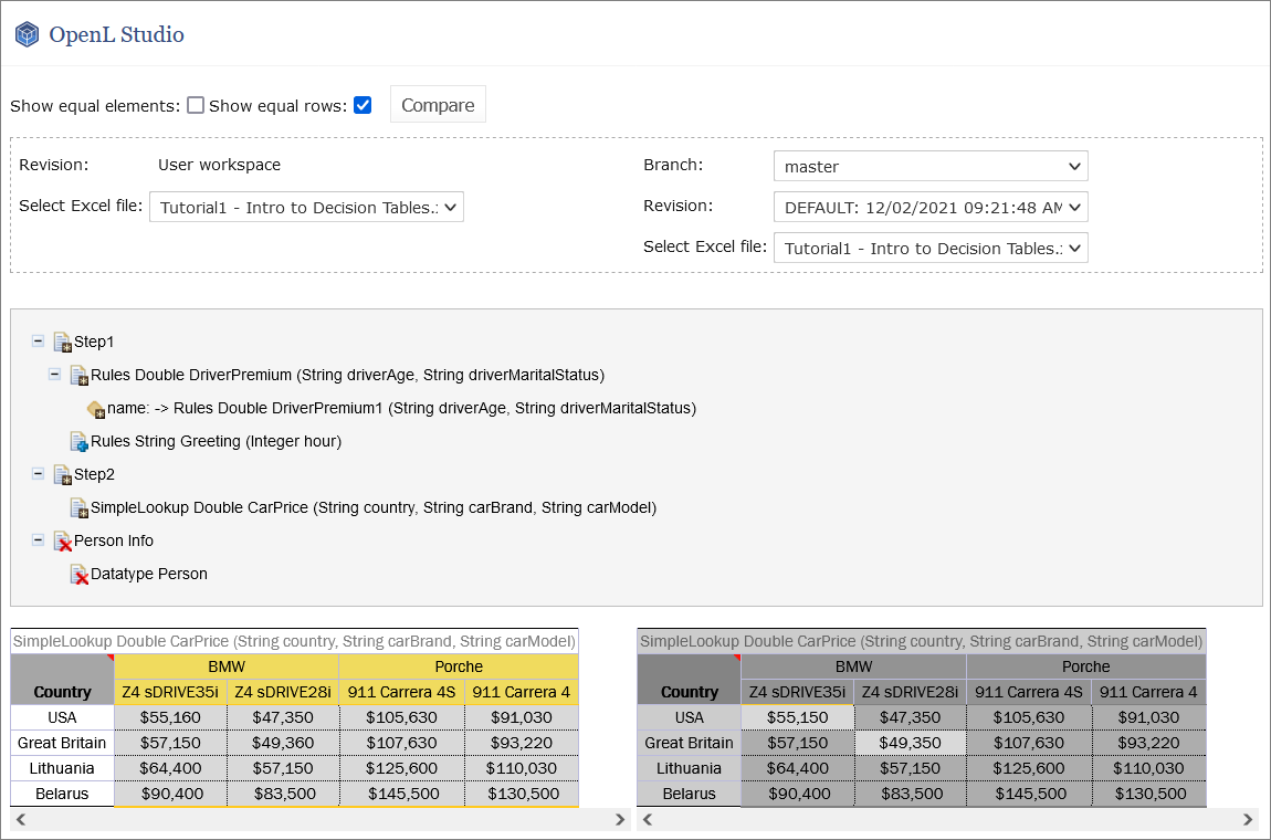 OpenL Studio provides a function for comparing files and sheets in Excel files between two project revisions. To compare contents of the currently opened project revision with any other revision, proceed as follows:
