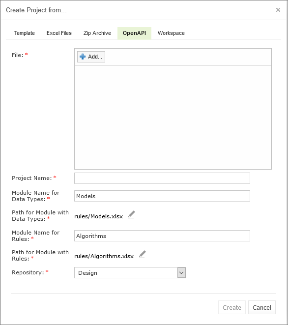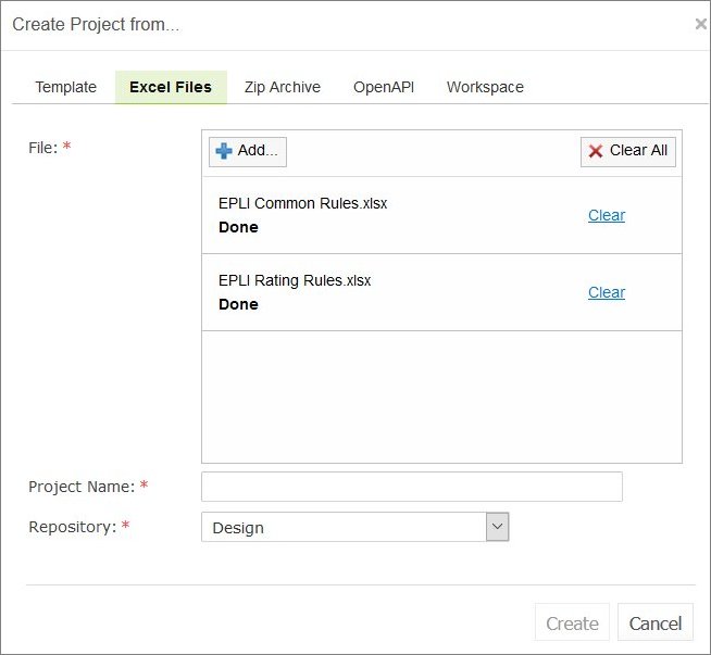 A rule project in the Design repository can be created by loading one or more Excel files that contain OpenL rule tables or entire rule projects.