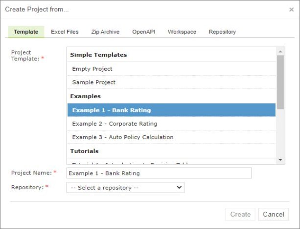 | Simple Templates | Include the following: - Sample Project is a very simple project consisting of one rule table and hence, one Excel file. - Empty Project allows creating a project with an empty Excel file. Open the project and create tables as needed. |