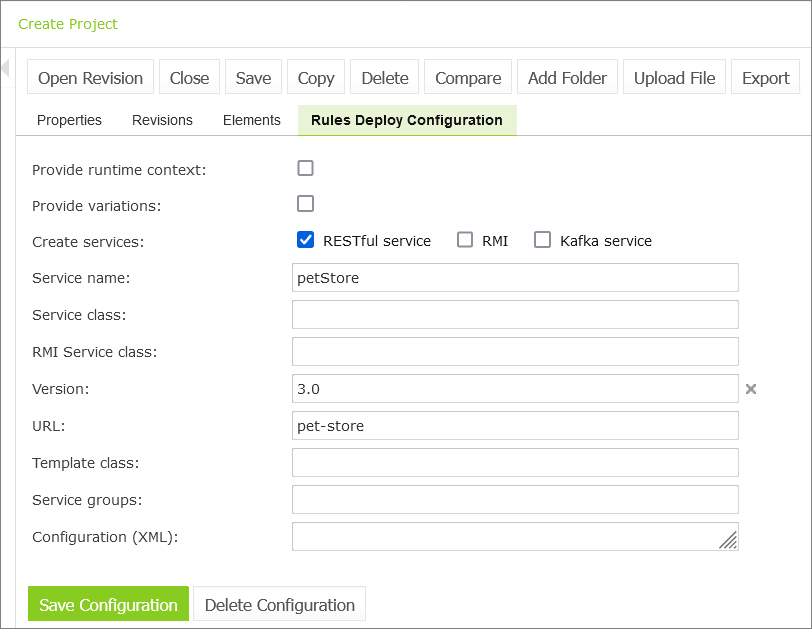 For more information on the Rules Deploy Configuration tab settings configuration, see OpenL Tablets Rule Services Usage and Customization Guide > Service Configurer.
