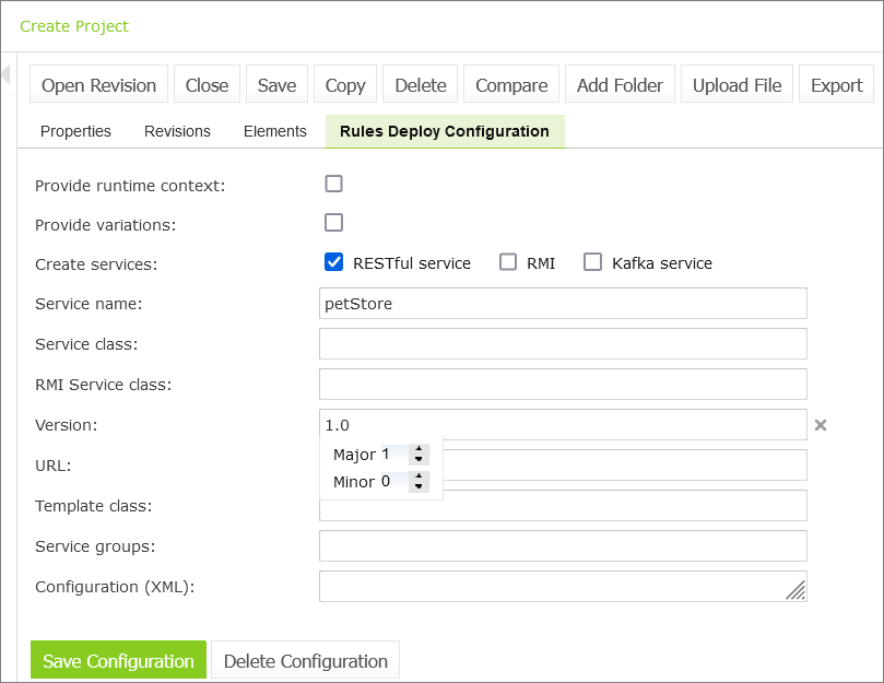 The selected services version is displayed in Rules Deploy Configuration for the selected project. For the example displayed in this section, the project version is 1.0.