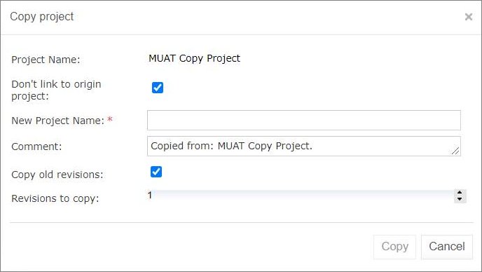 - When you need to copy a project with revisions, select the Copy old revisions check box and provide the necessary number of revisions in the Revisions to copy field.