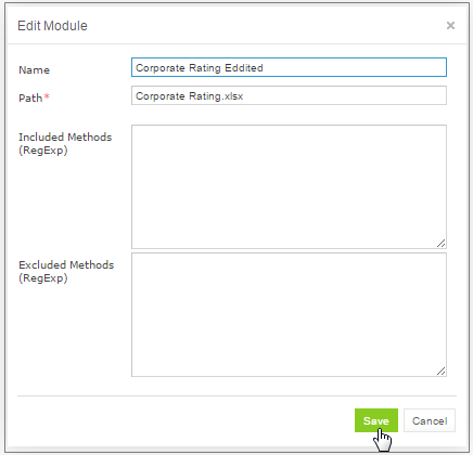 To modify module configuration, such as module name, path, and included or excluded methods, in the Module page place the mouse cursor over the module name and click Edit