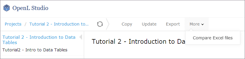 In OpenL Studio Rules Editor, in the top line menu, select More > Compare Excel Files.