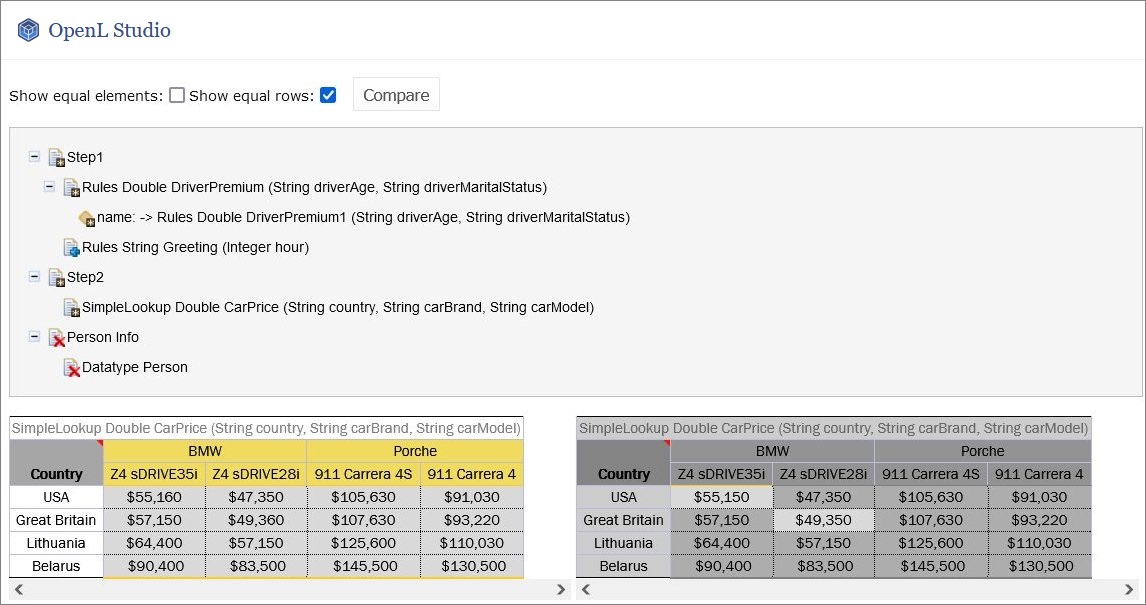 OpenL Studio supports comparing contents of Excel files displaying tables and Excel elements that are modified. To compare two Excel files, proceed as follows: