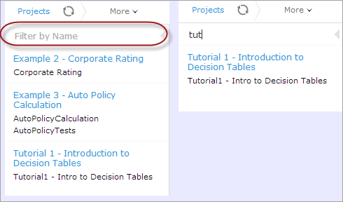 To limit a list of projects displayed in the Projects list, start typing a project name in the field located above the list of projects.