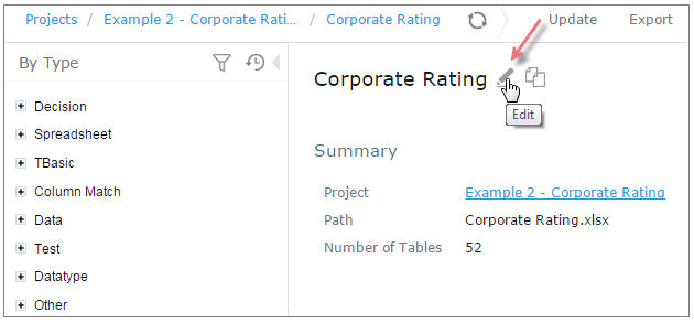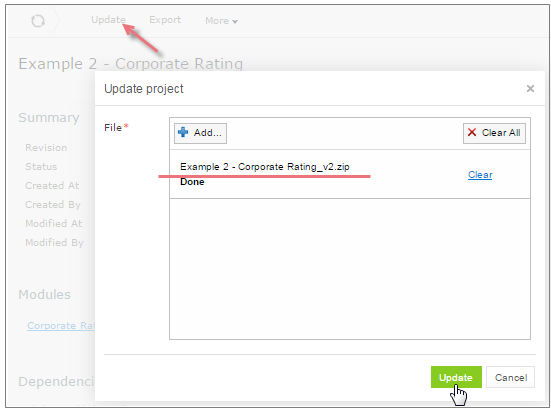 To update a project directly in Rules Editor, in the top line menu, click Update and make the necessary changes.