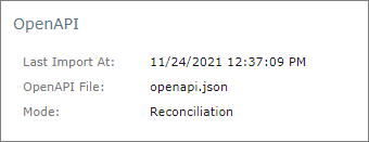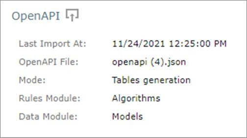 | Last Import At | Date of the last upload of the OpenAPI file. The OpenAPI file can be replaced in the Repository tab or generated or regenerated from rules tables and datatype tables. |