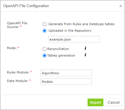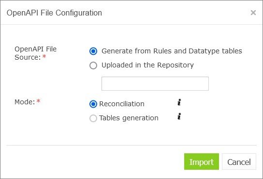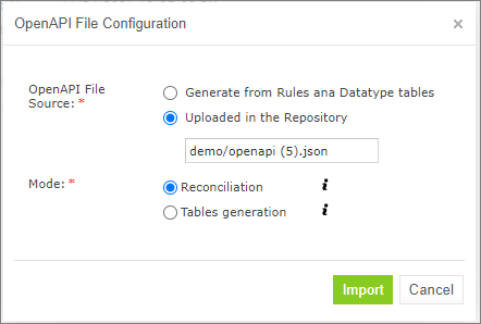 If the OpenAPI file already exists, the Uploaded in the Repository option is selected by default and the file name is displayed in the field. If the file must be regenerated according to the current project tables, the Generate from Rules and Datatype tables and Reconciliation options must be selected.