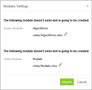 - If necessary, modify the default values for the rules and data modules and click Import.