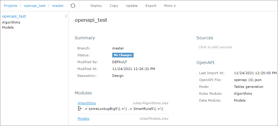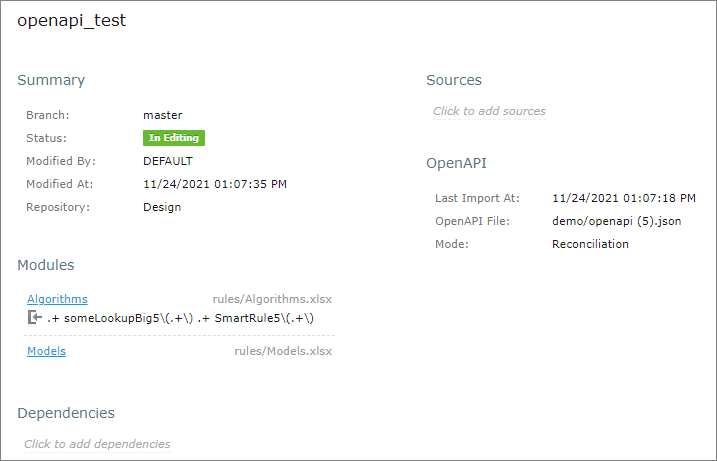 The generated project contains information about the last file import date, name of the OpenAPI file, mode, and modules names in rules.xml. This information is available in OpenL Studio, the OpenAPI section.
