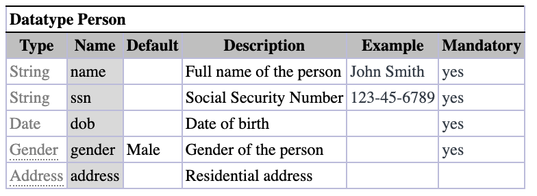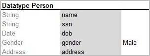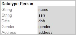 Consider the case when a hierarchical logical data structure must be created. The following example of a Datatype table defines a custom data type called Person. The table represents a structure of the Person data object and combines Person’s data elements, such as name, social security number, date of birth, gender, and address.