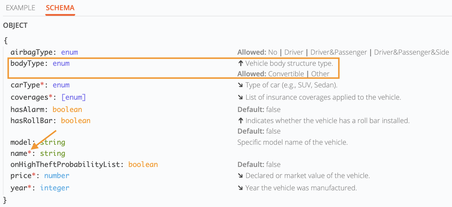 - Fields marked as Mandatory are indicated with an asterisk (*) in the schema view, helping users identify required fields at a glance.