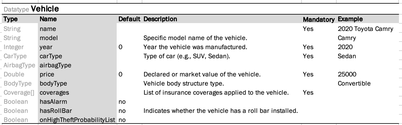Columns Used Column Headers Required Type, Name No Type, Name, Default No Any additional columns (e.g., Description, Example, Mandatory) Yes Note: When column headers are present, all columns in a Datatype table may appear in any order. Optional columns can be included in any combination.