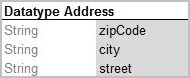 Note that data attribute, or element, address of Person has, by-turn, custom data type Address and consists of zip code, city, and street attributes.