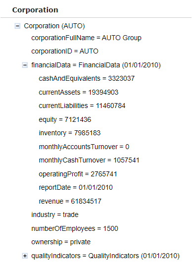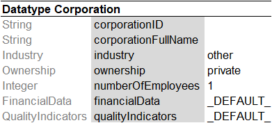 Consider an example of a Datatype table defining a custom data type called Corporation. The following table represents a structure of the Corporation data object and combines Corporation data elements, such as ID, full name, industry, ownership, and number of employees. If necessary, default values can be defined in the Datatype table for the fields of complex type when combination of fields exists with default values.