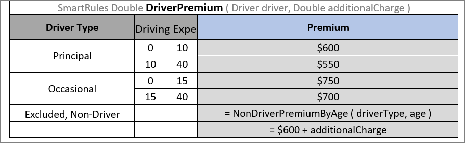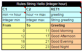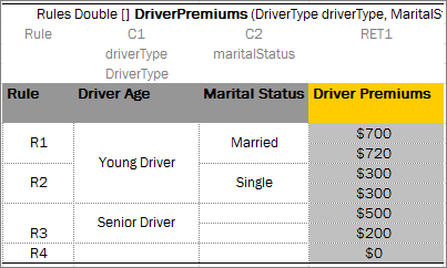 Yes | Concrete parameter values. Any cell can contain formula, a mathematical one or a rule call, instead of concrete value and calculate the value. This formula can reference parameters in the rule header and any parameters of condition columns in the return column. |
