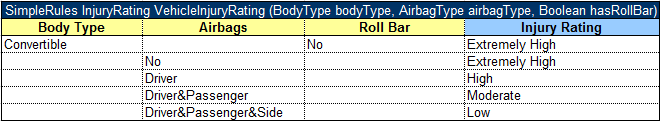 A simplified decision table which has simple conditions for each parameter and a simple return can be easily represented as a simple rules table.