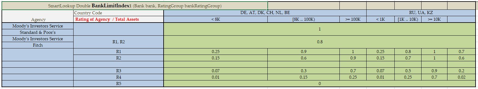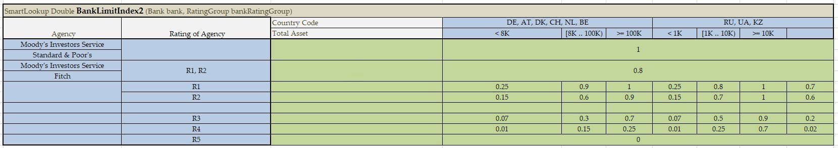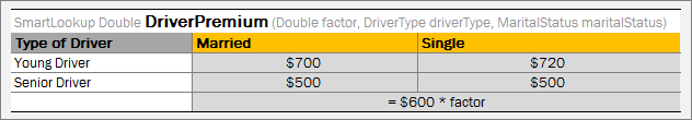 A lookup decision table with simple conditions that check equality or inclusion of an input parameter with a condition value and a direct return (without expression) can be easily represented as a smart lookup table. This table resembles a smart rules table but has horizontal conditions.