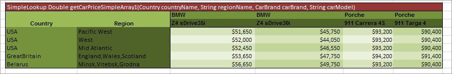 Range and array data types can be used in simplified and smart rules and lookup tables. If a condition is represented as an array or range, the rule is executed for any value from that array or range. As an example, in the following image, there is the same Car Price for all regions of Belarus and Great Britain, so, using an array, three rows for each of these countries can be replaced by a single one as displayed in the following table.