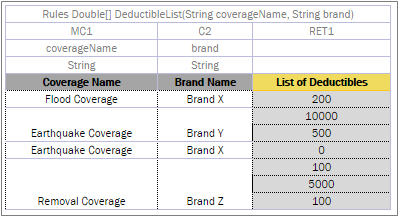 The horizontal conditions are marked as HC1, HC2 and so on. Every lookup matrix must start from the HC or RET column. The first HC or RET column must go after all vertical conditions, such as C, Rule, and comment columns. There can be no comment column in the horizontal conditions part. The RET section can be placed in any place of the lookup headers row. HC columns do not have the Titles section.