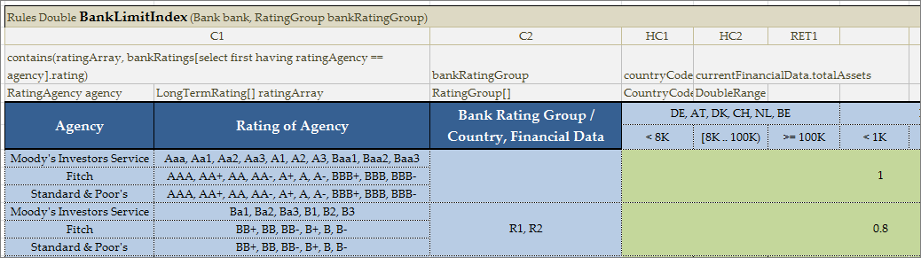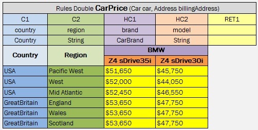A rules table is a regular decision table with vertical and optional horizontal conditions where the structure of the condition and return columns is explicitly declared by a user by starting column headers with the characters specific for each column as described in Decision Table Structure.